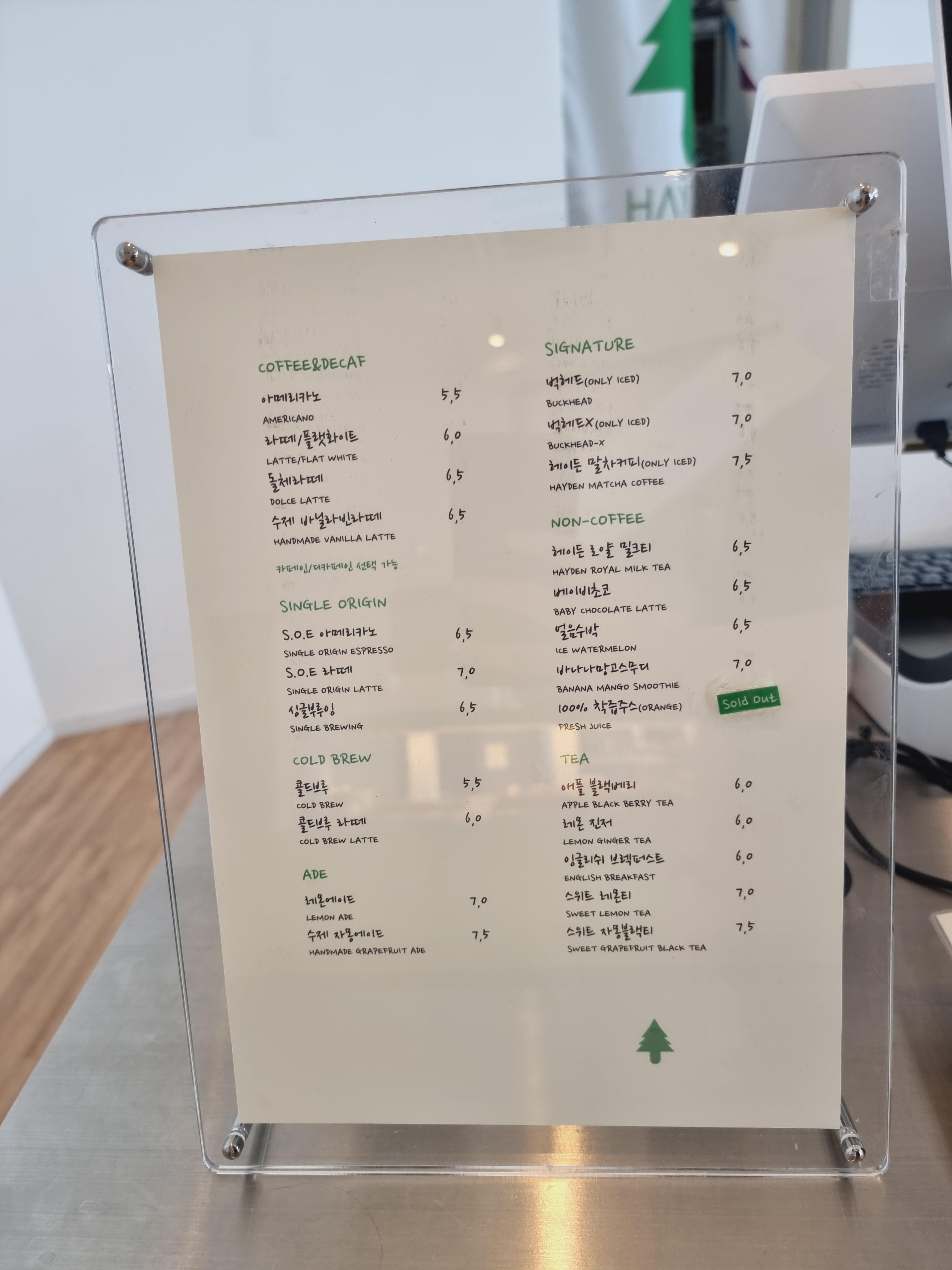 헤이든 메뉴판이에요. 커피, 콜드브루, 에이드와 티