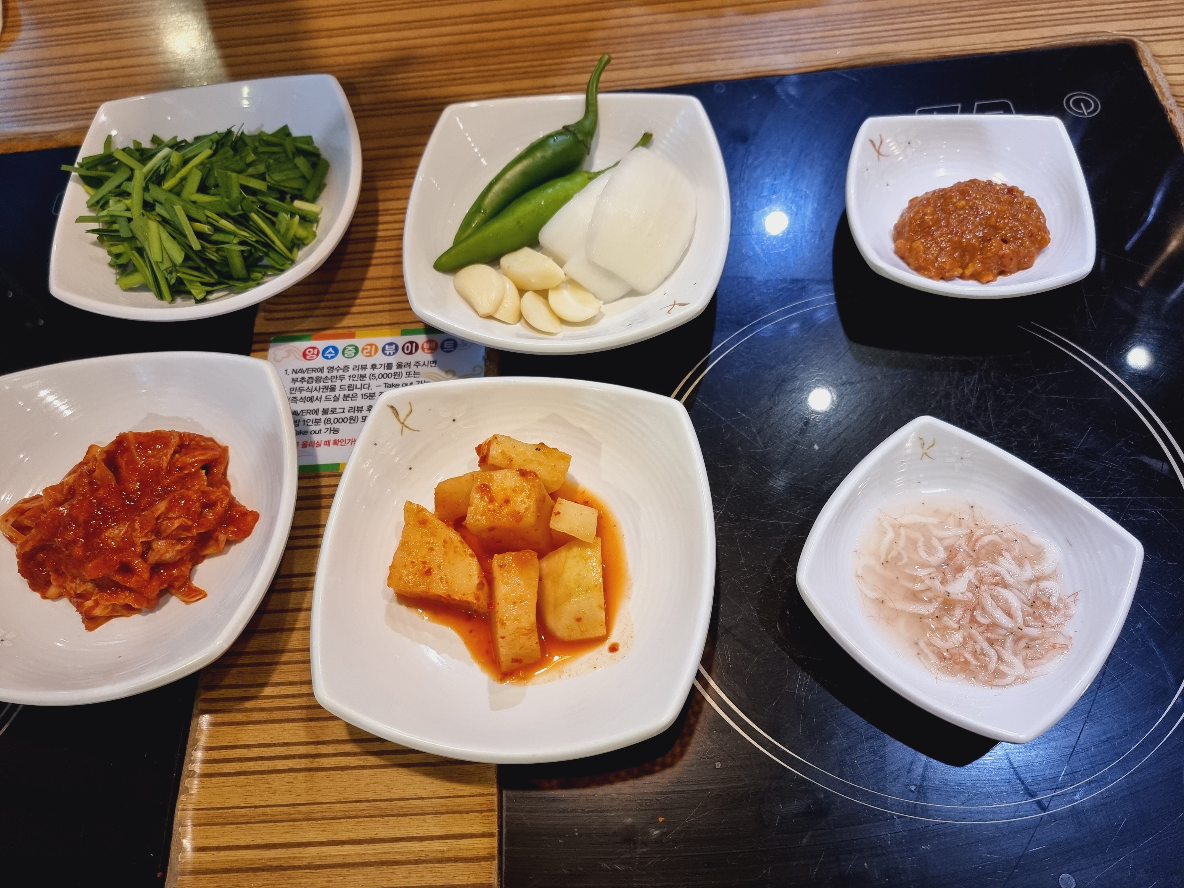필수적으로 나오는 김치와 새우젓, 마늘, 양파